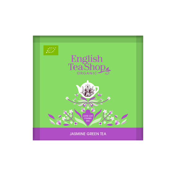 Thé vert biologique au jasmin et à la fleur de sureau en sachet pyramide.